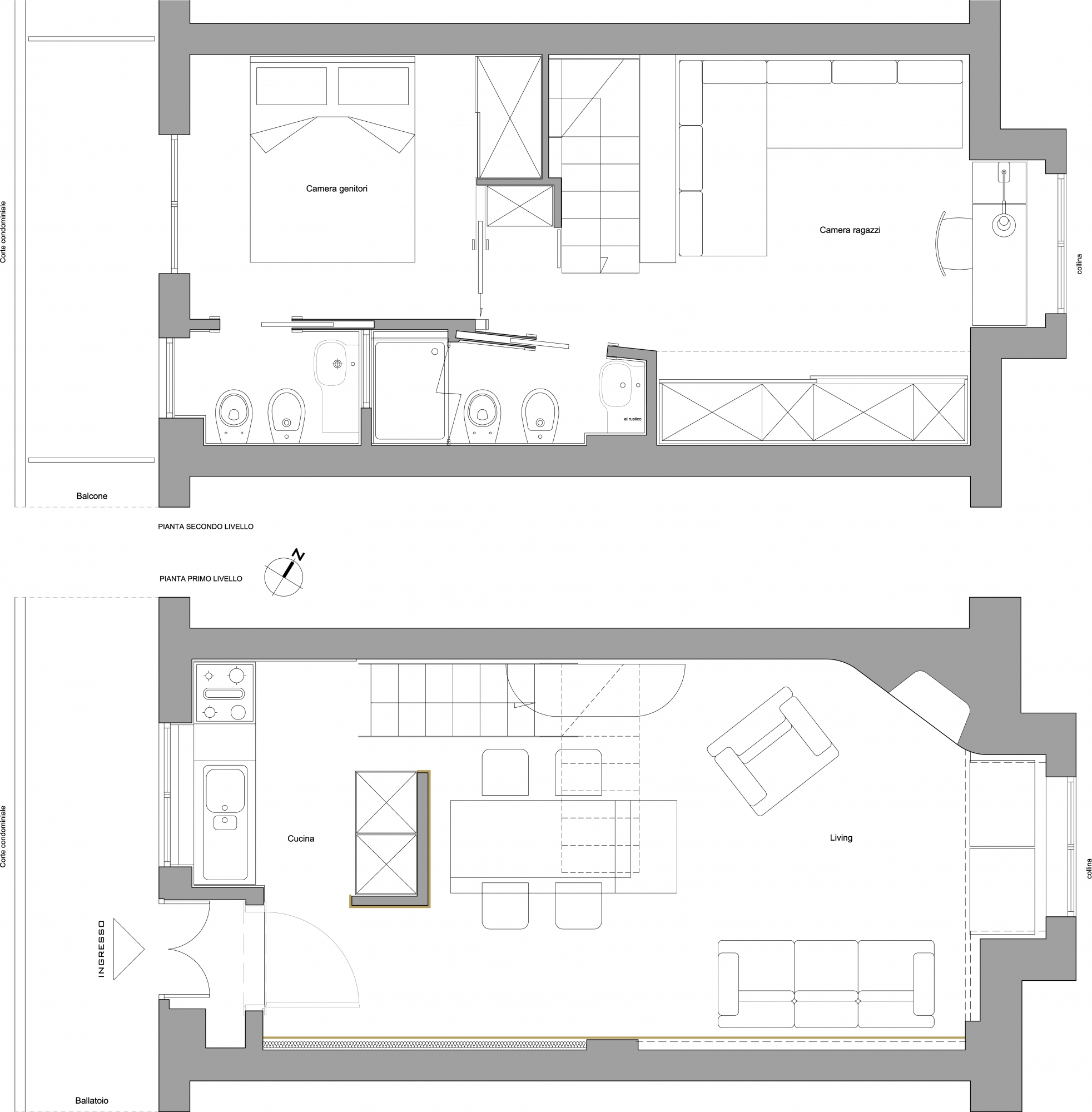 Il secondo livello troviamo due camere di simile superficie utile e due bagni a spalla. Una parete armadio nella camera dei ragazzi ed un armadio a ponte sulle scale garantiscono le necessità del soggiorno in montagna. Nel disimpegno è previsto un piccolo arredo a servizio del bagno.