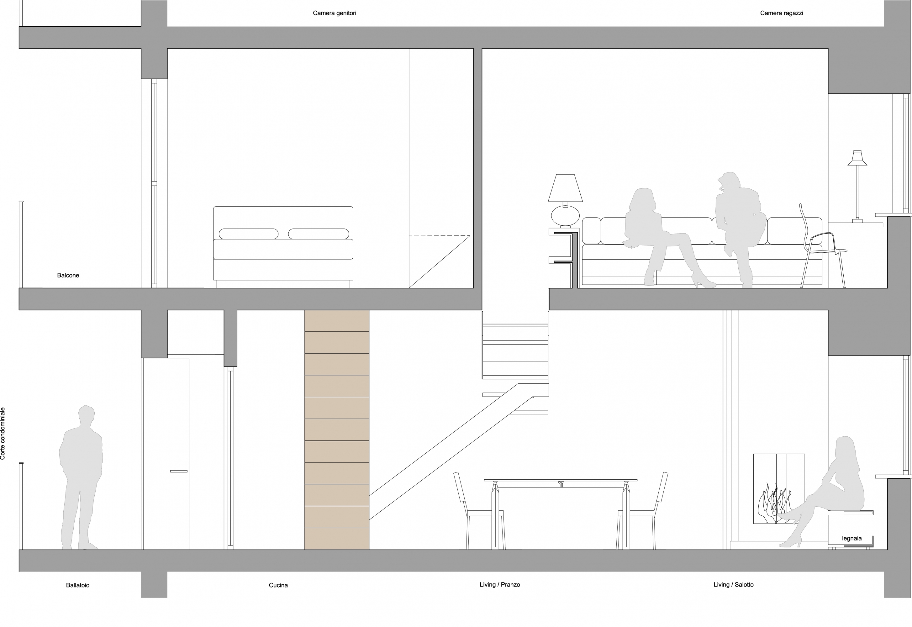 Entrando dal ballatoio una boiserie in legno ci accompagna per tutta la lunghezza fino a rivestire lo spazio della finestra. Nel living la scale interna è un elemento sospeso che attraversa l’ambiente. Dalla panca del bow window la percezione è completa: il camino, lo spazio divani, la scala con il tavolo, la parete cucina ed, a circa otto metri, l’ingresso.
