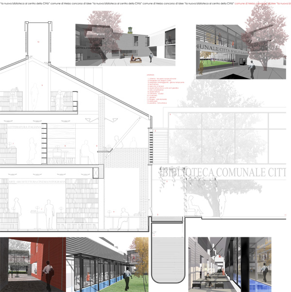 La distribuzione delle funzioni prevede la collocazione dei servizi e degli uffici sul fronte di via Pasta e sul sagrato, mentre gli spazi destinati alla lettura sono interni al lotto, e sul giardino. La Sala Leonardo, ipogea, luogo da scoprire, nasce come spazio flessibile. La sala, proiezione del ponte nel sottosuolo, si connette percettivamente ad esso mediante il Periscopio: un grande pozzo di luce a forma di prisma irregolare. Un sistema verticale di alternanze tra pieni e vuoti, ponte-ingresso-ipogeo, si interseca con il sistema orizzontale degli attraversamenti,sagrato-corte-giardino.La nuova biblioteca della città, fulcro urbano, centro di raccolta e produzione di idee e delle attività sociali, per dirla con Bernardo Secchi, un progetto incrementale.